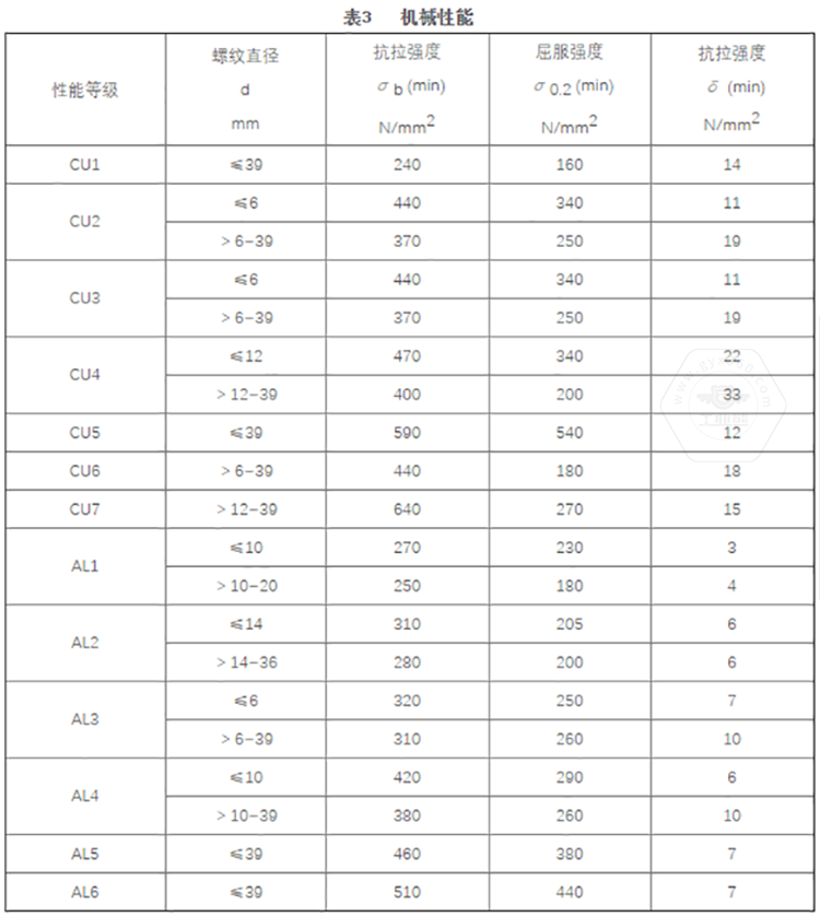 GB/T 3098.10標(biāo)準(zhǔn)中將銅制緊固件分為7個性能等級,標(biāo)記代號由字母及數(shù)字兩部分組成,即有色金屬化學(xué)元素字母加數(shù)字。其性能等級為CU1、CU2、CU3、CU4、CU5、CU6、CU7。標(biāo)準(zhǔn)中同時推薦了對應(yīng)性能等級選用的銅材料牌號。